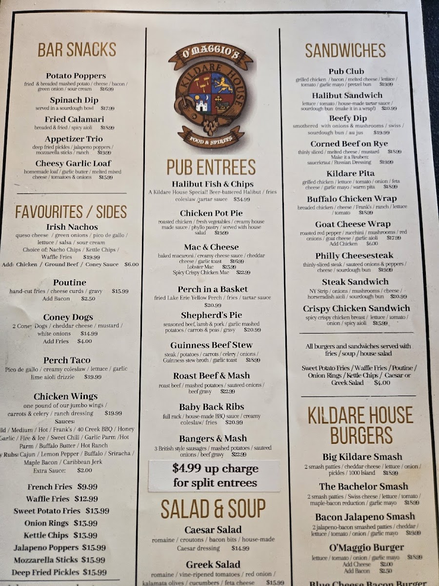 Welcome to O'Maggio's Kildare House, an inviting bar located in Windsor, Ontario, where hearty flavors and a friendly atmosphere collide. Their menu is a delightful melange of classic bar fare and unique specialties. Signature dishes like the Halibut Fish and Chips and Lobster Mac showcase generous portions, ensuring satisfaction with every bite.